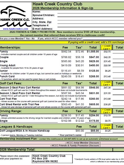 We've always worked hard to keep membership prices low from year to year, but we've worked even harder to maintain the quality of our course. The success of Hawk Creek Country Club was built on friendships and families, and it remains a great place to spend quality time with your buddies or your spouse or kids, or a great place to expand your business relationships. Thanks again for all your support!