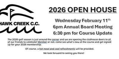 Welcome to Hawk Creek Country Club, a small town course with a big heart. We're glad you could make it to our site, and now we're hoping you can make it to our course.
